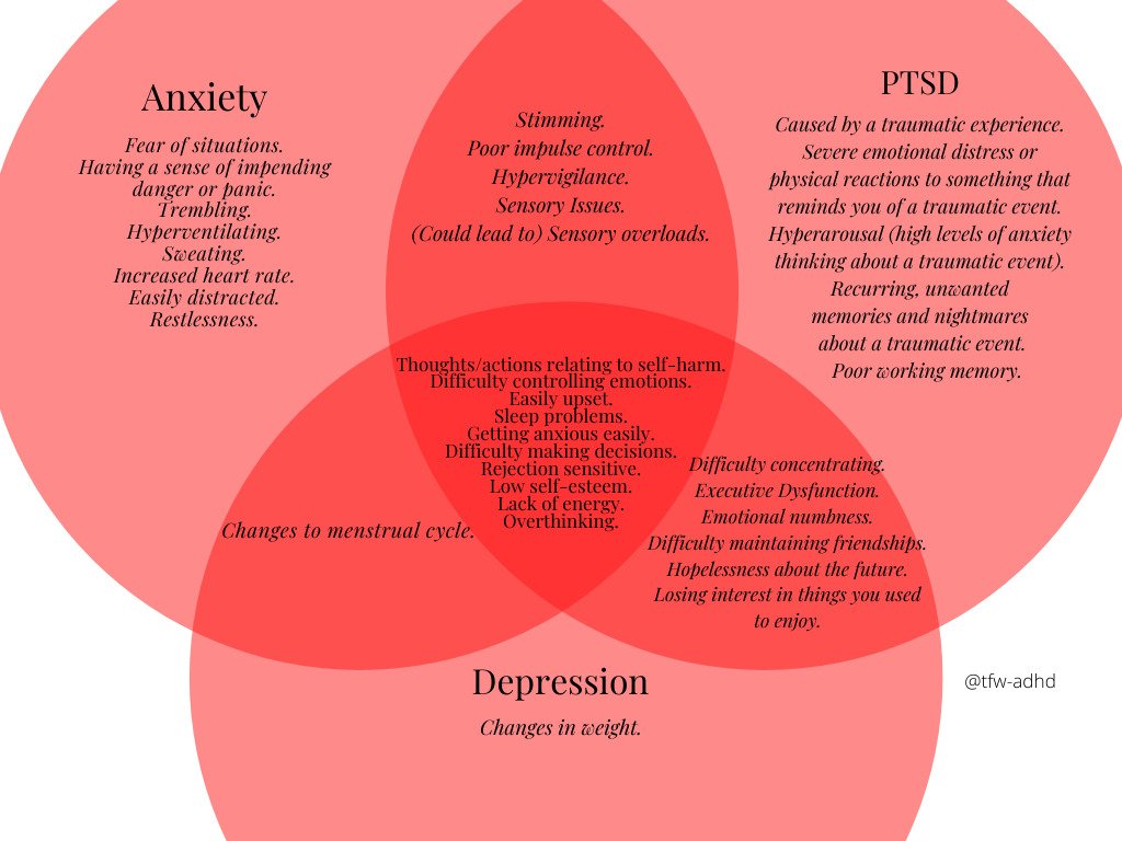 Trauma symptoms can overlap with anxiety and depression, which is why trauma is sometimes misdiagnosed or overlooked. Anxiety is often defined by future-oriented worry and behaviors driven by fear. Depression, in contrast, typically focuses on thoughts of the past which influence low mood, hopelessness for the future, and a loss of interest in daily activities. While anxiety and depression can exist on their own, they are also common outcomes of unresolved trauma. Treating trauma often reduces anxiety and depressive symptoms at their core.